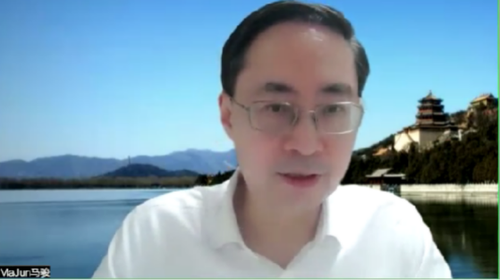 图2 中国金融学会绿色金融专业委员会主任、北京绿金院院长马骏致开场辞
